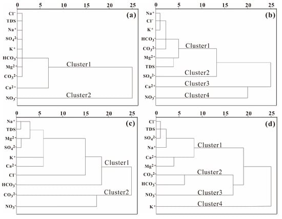 Hierarchical cluster analysis of the water bodies in Hulun Lake Basin in different seasons: (a) lake water in the non-frozen season; (b) lake water in the frozen season; (c) groundwater in the non-frozen season; (d) groundwater in the frozen season.