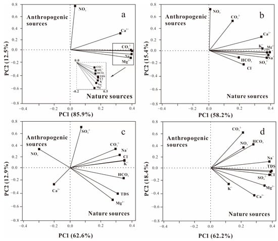 Principal component analysis of the major ions in water bodies in the Hulun Lake Basin in different seasons: (a) lake water in the non-frozen season; (b) groundwater in the non-frozen season; (c) lake water in the frozen season; (d) groundwater in the frozen season.