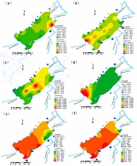 Spatial interpolation map of the main hydrochemical ions in the Hulun Lake Basin: (a) Ca2+ concentration during the frozen season; (b) Ca2+ concentration during the non-frozen season; (c) NO3− concentration during the frozen season; (d) NO3− concentration during the non-frozen season; (e) SO42− concentration during the frozen season; (f) season SO42− concentration during the non-frozen.