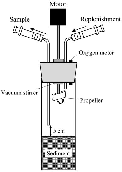 Artificial seawater (Marine Art SF-1, Osaka Yakken, Osaka, Japan; equivalent to 35 psu) was gently injected on top of the material to avoid sediment suspension. Subsequently, the core was sealed with a silicon plug, ensuring that no air bubbles were left in the core, and placed in a water bath where the water temperature was maintained at 23 °C. The silicone plug was equipped with a fluoroplastic propeller (model no. FLSPI, PTFE straight blade, As One Corporation) and brushless motor (BMU230A-15-2, Oriental Motor Corporation, Tokyo, Japan), and a magnetic drive vacuum agitator (Model No. F-24/40, PTFE magnet-type, As One Corporation) was installed. Using these devices, the overlying water could be agitated at any rotation speed in sealed conditions without exposure to the outside air. As a result, the overlying water in the core could be sufficiently mixed, and the flow conditions in the core could be controlled []. In addition, the silicon plug was equipped with a dissolved oxygen (DO) meter probe (WA-2017SD, FUSO Inc., Tokyo, Japan) to continuously measure the DO concentration of the overlying water at 10-min intervals [] (Figure 1).