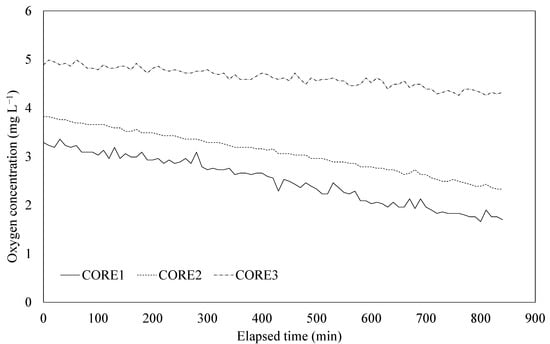 Visual inspection revealed no resuspension of sediment particles during the experiment. Figure 3 shows the temporal variations in the DO concentration in the overlying water during the oxygen consumption experiment. All three treatments showed a monotonous decrease due to the sedimentary DO consumption. However, each treatment showed a different decreasing rate reflecting the sand-capping effect for CORE2 and CORE3. The differences in initial DO concentrations among CORE1 (0% pumice weight ratio), CORE2 (46% pumice weight ratio), and CORE3 (100% pumice weight ratio) were due to DO consumption during the half-day acclimation period.
