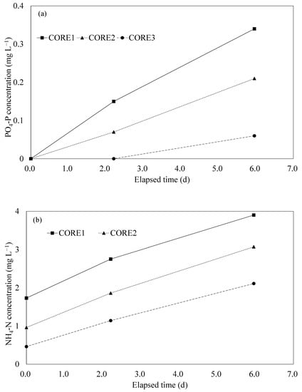 Figure 5 shows the temporal variations in nutrient concentrations in the overlying water during the nutrient release experiment. The PO4-P and NH4-N concentrations in the overlying water monotonously increased as results of continuous release from the sediment. The differences in the initial NH4-N concentrations among CORE1, CORE2, and CORE3 were thought to be due to differences in their release rates during the experiment (Figure 5b).