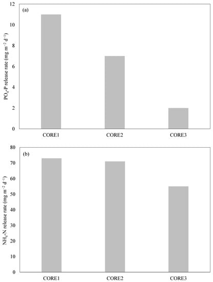 From these results, the nutrient release rates calculated using Equation (2) are shown in Figure 6. The PO4-P release rate for CORE1 was 11 mg m−2 d−1, whereas that for CORE2 was 7 mg m−2 d−1, showing a 36% reduction compared with that of CORE1 (Figure 6a). Furthermore, the PO4-P release rate for CORE3 was 2 mg m−2 d−1, which was 82% lower than that of CORE1. This was thought to be due to an increase in PO4-P adsorption in the surface layer of the sediment by the placement of crushed pumice.