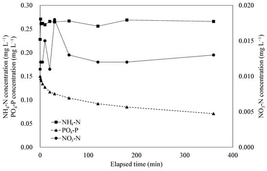 During the experiment, the water temperature remained within the range of 18.6 °C to 20.6 °C because the beakers were kept at room temperature. The pH was 8.2 before the crushed pumice stone was added but decreased slightly to 8.0 after 6 h. The ORP was 391 mV before the crushed pumice stone was added but increased slightly to 400 mV after 2 h and decreased to 391 mV 6 h after the addition. The water temperature, pH, and ORP fluctuated slightly but were not considered to have changed enough to affect nutrient adsorption and desorption. No fluctuations in the NH4-N and PO4-P concentrations in the control beaker were observed.