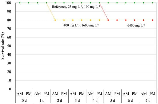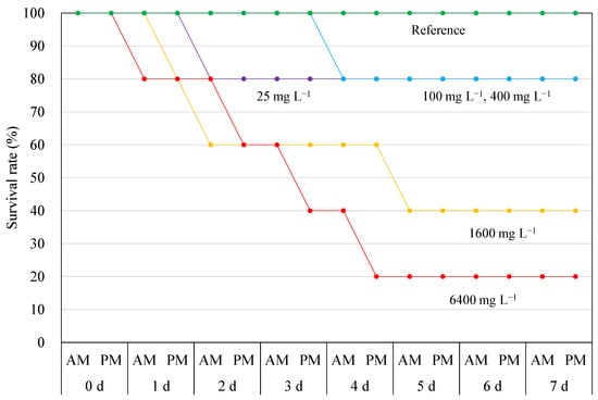The results of the incubation experiment showed that the survival rate remained 100% until day 7 (end of the experiment) at 25 and 100 mg L−1 concentrations. At 400 and 1600 mg L−1 concentrations, one individual died on day 2 of the experiment, and the survival rate on day 7 was 80%. At 6400 mg L−1, one individual died on day 5 of the experiment, and the survival rate on day 7 was 80%. In contrast, in the control experiment, the survival rate remained at 100% until day 7 (Figure 8).