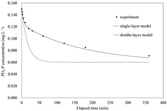 Figure 10 compares the results of the adsorption experiments with the values calculated using Equation (5), assuming Ceq = 0.060 (mg L−1) and k = 2.0 × 10−3 (L g−1 min−1), which was estimated by the decreasing rate of PO4-P concentration at the beginning of the experiment. The results from the single-layer model did not reasonably reproduce the experiment, and the experimental results showed a slower but continuous decrease in the PO4-P concentration.