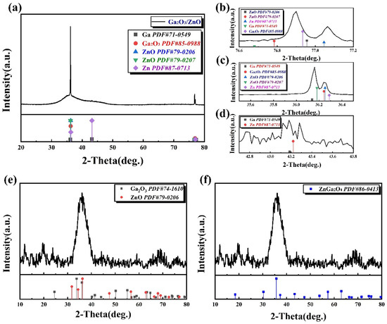 From the XRD spectra of the Ga2O3/ZnO samples shown in Figure 2a–d, the detected diffraction peaks in 30–40°, 43–43.4°, and 76.5–77.4° were in the shape of humps, which are similar to those of amorphous Ga2O3 reported by Cui et al. [27]. Therefore, the Ga-based liquid metal composite Ga2O3/ZnO synthesized in this study is considered amorphous. The reason why there is a crystal diffraction peak above the steamed bread peak may be related to the respective oxide films formed on the surface of Zn and Ga and also because the liquid metal Ga is amorphous. After melting and ultrasonic treatment, Zn and Ga form a multiphase liquid metal that appears to be a liquid phase but actually contains a solid core of a nanometer–micron size [28]. As shown in Figure 2a, two diffraction peaks were observed at 36.243° and 76.934°, which were attributed to the (−110) and (−220) crystal planes of Ga2O3, respectively, based on the standard diffraction peak card for Ga2O3 (PDF#85–0988). According to the standard diffraction peak card for ZnO (PDF#79–0206), the two peaks observed at 36.252° and 76.956° were indexed to the (101) and (202) crystal planes of ZnO, respectively. The (101) and (202) crystal planes of ZnO, corresponding to the two peaks at 36.181° and 76.784°, respectively, are consistent with the standard diffraction peak card for ZnO (PDF#79–0207). Based on the standard diffraction peak card for Zn (PDF#87–0713), the peaks at 36.289°, 43.22°, and 77.046° were assigned to the (002), (101), and (004) crystal planes of Zn, respectively. The four peaks observed at 43.186°, 36.138°, 77.329°, and 76.680° were attributed to the (510), (112), (840), and (224) crystal planes of Ga (PDF#71–0549), respectively. After the smelting and ultrasonic dispersion of the GaZn alloy, strong diffraction peaks of Ga2O3, ZnO, Zn, and Ga were observed. From the above results, the prepared catalyst was found to be a liquid metal Ga surface coated by Ga2O3, while Zn is attached to the Ga2O3 surface in the state of ZnO, which further confirmed the formation of the Ga2O3/ZnO composite.