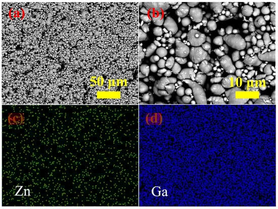 (a) SEM morphology of the Ga2O3/ZnO, (b) SEM morphology of the Ga2O3/ZnO at greater magnification, (c) the elemental mapping of Zn, and (d) the elemental mapping of Ga.
