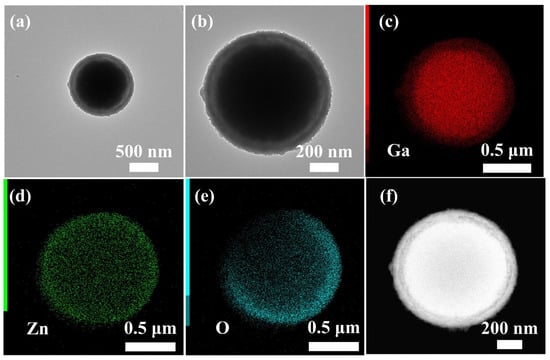 (a,b) TEM morphology of the Ga2O3/ZnO at different magnifications, and the elemental mapping of (c) Ga, (d) Zn, (e) O, and (f) the stem microstructure of Ga2O3/ZnO.