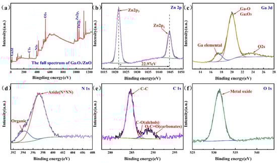 The XPS general spectra of (a) Ga2O3/ZnO, (b) the magnified Zn, (c) Ga, (d) N, (e) C, and (f) O spectra.