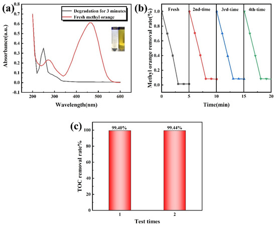 The TOC test results for the MO solutions before and after degradation are shown in Figure 7c. The TOC contents of MO measured twice before degradation were 36,796 and 36,895, respectively, whereas the values decreased to 219.3 and 208, respectively, after MO degradation for 3 min. Therefore, the TOC removal rates were as high as 99.40% and 99.44%, respectively, achieving an average removal rate of 99.42%. Furthermore, the mineralization of organic matter may occur in the process of degradation of MO, which leads to the complete oxidation of organic molecules to H2O, CO2, and inorganic salt ions, such as SO42−, NO3−, and so on. The rapid decrease in the TOC value of methyl orange solution indicates that the methyl orange molecules in this process have been completely degraded [40]. Therefore, it is concluded that MO removal by this catalyst involves the degradation of MO.