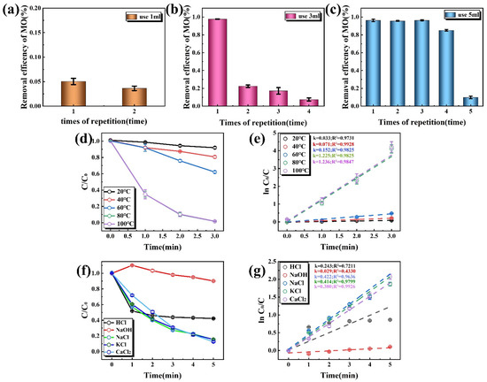 The influence of reuse on removal rates at different catalyst volumes: (a) 1 mL, (b) 3 mL, and (c) 5 mL. (d) The effect of different alloy extraction temperatures on the concentration curves for the degradation of MO and (e) ln C/C0. (f) The relationship between C/C0 and time for the degradation of MO with K+, Ca2+, Na+, HCl, and NaOH, and (g) corresponding linear fitting curves of ln (C0/C) versus time.