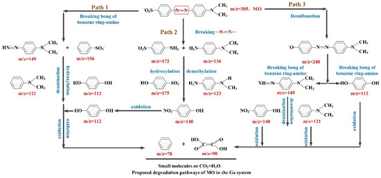 Proposed degradation pathways of MO in the Ga2O3/ZnO system.