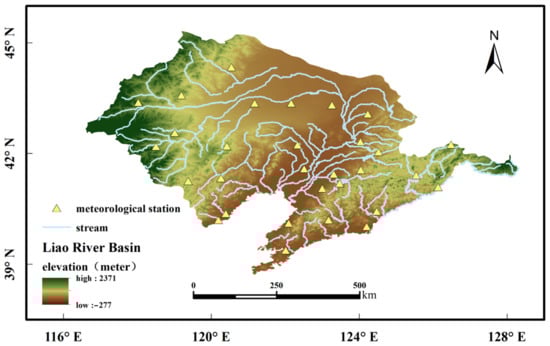 The LRB is located in the southwest of Northeast China and flows through the four provinces (or Autonomous Region) of Hebei, Jilin, Liaoning, and Inner Mongolia into the Bohai Sea, with a total length of 1345 km and a drainage area of 219,000 km2. It is one of the seven major rivers in China. The LRB has a semi-humid monsoon climate in most parts. Floods in the basin are frequent, and a large flood occurs every 7–8 years on average. The LRB is becoming a key research objective in the field of climate and hydrology. The range of 116° E–129° E, 38° N–46° N was selected as the research area.