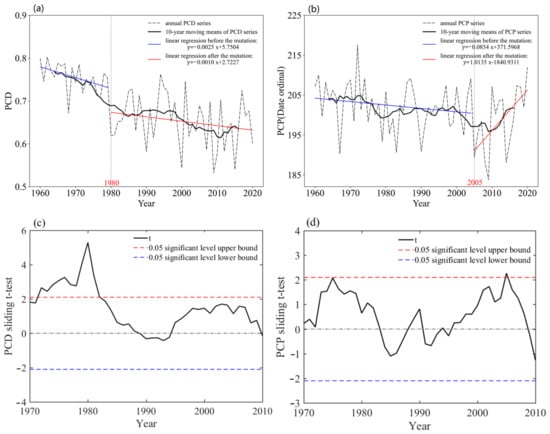 The annual average PCD and PCP were calculated in this study based on nearly 60 years of daily precipitation datasets from 30 meteorological stations in the LRB. To make the exploration of secular trends in sequence more convincing, 10-year moving averages were calculated, and the sliding t-test was performed to identify the mutation point of the PCD and PCP sequences (Figure 2).