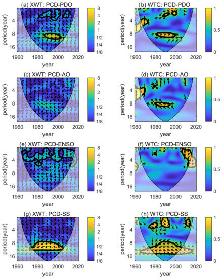 CWT spectrum between PCD and PDO/AO/ENSO/SS. (a,c,e,g) show the results of XWT; (b,d,f,h) show the results of WTC.