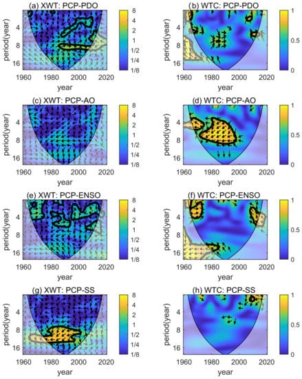 In the spectral analysis of XWT of PCP and SS in Figure 5g, it can be observed that the PCP has a significant anti-phase oscillation with SS from 1974 to 2001 with a period of 7.5–14 a. In addition, a small anti-phase oscillation in 2009 with a period of 1.5 a is exhibited in the spectral analysis of XWT in Figure 5h.
