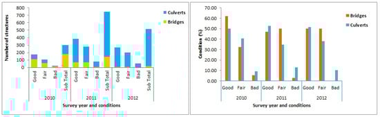 Conditions of cross-drainage structures in number (left) and percentage (right) based on inventory reports from 2011 to 2012 EC.