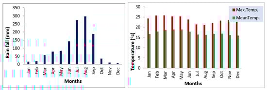 Long-term monthly rainfall (left) and temperature data (right) of the study area (Source: []).