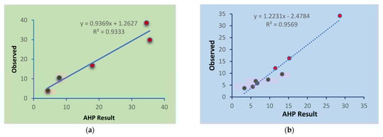 As per verifications performed through site investigation, the AHP results obtained from technical interviews and focal group discussions gave a very strong correlation. As shown in Figure 5, the AHP tool is acceptable and can be used as a good qualitative measure of multicriteria decision making. Correlation results of 0.93 and 0.96 are obtained for cross- and longitudinal drainage infrastructures, respectively.