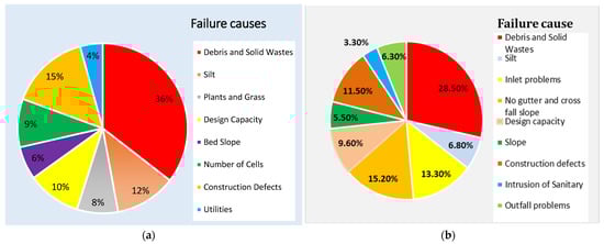 Using an AHP pairwise comparison decision making, the failure cause parameters are selected, and the results in priority order are obtained. Acceptable consistency ratios (CRs) of 2.6% and 2.4% are obtained for the cross- and longitudinal drainage failure cause assessments. As shown in Figure 6, solid wastes are the dominant failure causes for both cross- and longitudinal drainage structures, accounting for approximately 36% and 28.5%, respectively. Construction defects of the crossing structures, accounting for 16%, and a combination of cross-fall and gutter problems of longitudinal drainage systems, accounting for 15.2%, are the second dominant failure causes. Design problems and negligence during construction supervision also have critical impacts on drainage infrastructure failure. Integration and outfall problems of longitudinal drainage systems also have considerable impacts on the failure of longitudinal drainage infrastructures as a result of backwater flow and clogging.
