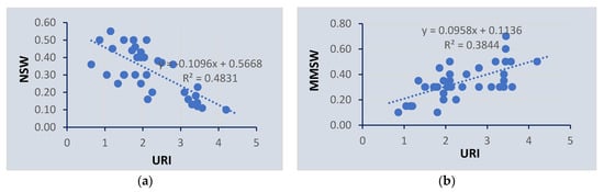 Using the urbanization index, the failure mode of cross-drainage structures is developed as a result of the dominant failure causes of natural solid waste (NSW) and man-made solid waste (MMSW). The results in Figure 7 show that there is a strong positive correlation between urbanization and man-made solid wastes. However, natural solid wastes and debris such as plants, grass, and silts have a negative correlation with urbanization. The results indicate that cross-drainage structures in highly urbanized areas fail due to man-made solid wastes such as plastic, construction, and other wastes. However, crossing structures in semi-urban and less developed areas fail due to silt accumulation and plantation. The results provide insight into the major failure causes during design, construction, and asset management. Due to the significant impact of solid wastes related to urbanization on structural failure, the results provide insight for decision makers to implement appropriate drainage structure follow-up, maintenance, and waste management strategies for the serviceability of infrastructures. For semi-urban and rural catchments, appropriate upstream catchment management strategies should be practiced to protect cross-drainage infrastructures in addition to proper design and construction.