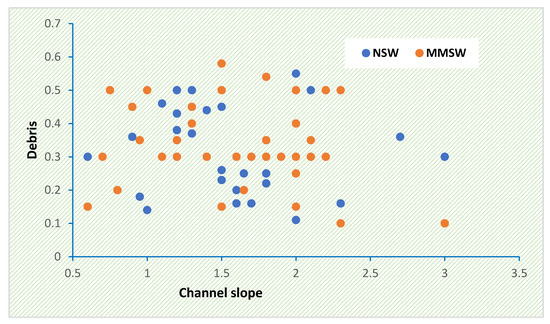 Correlation result of cross-drainage channel slope with man-made (MMSW) and natural solid wastes (debris) (NSW).