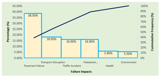 Failure impacts are analyzed using an AHP pairwise comparison by selecting six important parameters, obtaining an acceptable consistency ratio (CR) of 0.8%. Accordingly, our study results showed that the impact of both cross- and longitudinal drainage infrastructures is high on pavement (road surface) failure by creating potholes and asphalt distresses due to prolonged moisture and stored water through weak asphalt joints. Pavement failure will be aggravated by tire contact on wet pavements. As shown in Figure 10, pavement failure accounts for 38.5% of the total impact parameters, followed by transport disruption accounting for 18%. As per the research review of the poor drainage effect on road pavement performed by [], road pavement failure is a major adverse effect of drainage, and the other effects are economic impacts due to transport disruption, environmental effects, health problems related to waterborne diseases, and traffic accidents.