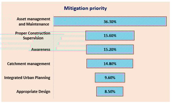 To mitigate urban drainage challenges, the AHP qualitative analysis results showed that THE management and periodic maintenance of infrastructure assets is the first priority, accounting for 36.3%, as shown in Figure 12 below. Most failed drainage infrastructures due to solid wastes can be managed through proper asset and solid waste management strategies with periodic maintenance and protection. Proper supervision during the construction of drainage infrastructures has a significant impact on mitigating drainage failures by contributing 15.6% of all mitigation measures. Technical focal group discussions on the issues strongly agreed with implementing proper drainage asset management and solid waste management practices for the safety of drainage infrastructures. Research carried out by [] supports our study result of drainage failure mitigation through appropriate integrated urban planning and catchment management practices. Other study approaches conducted by [,] verified the application of nonstructural drainage management and mitigation measures that are incorporated in our study’s mitigation measure based on integrated urban planning, catchment management, and appropriate designs. The research performed by [] on the same study area confirmed that nonstructural urban drainage management techniques through low-impact development (LID) practices are effective urban drainage mitigation measures which supports our study’s mitigation recommendation results.