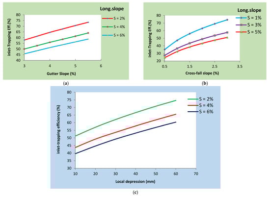 Longitudinal drainage inlet-trapping efficiency based on various parameters of: gutter slope (a), cross-fall slope (b), and local depression (c).