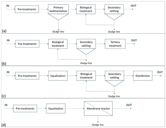Process flow diagrams of the case studies: (a) WWTP A, (b) WWTP B, (c) WWTP C (CAS), (d) WWTP C (MBR).
