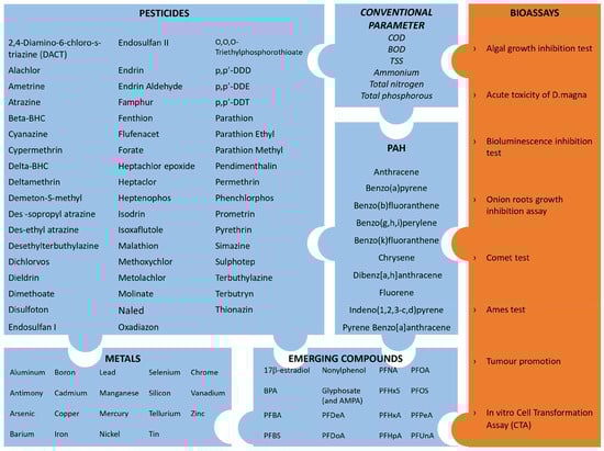 During the inventory phase, primary data were collected in order to create an input data folder. Primary data include effluent characteristics (for the conventional environmental footprint method) and bioassay results (for the alternative environmental footprint approach). Effluent properties include the standard parameters (BOD, COD, TSS, N, P, and others), as well as metals, semimetals, and organic compounds (see Figure 2). The results of the chemical survey are reported and discussed in [29,34] because the subsets of substances were quantified in a previous phase of the research, focused on evaluating the environmental impact in terms of released pollutants.