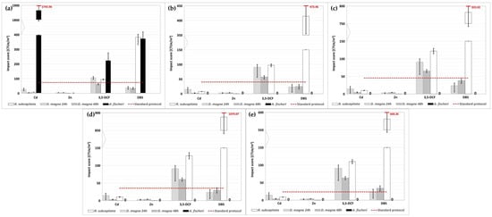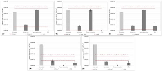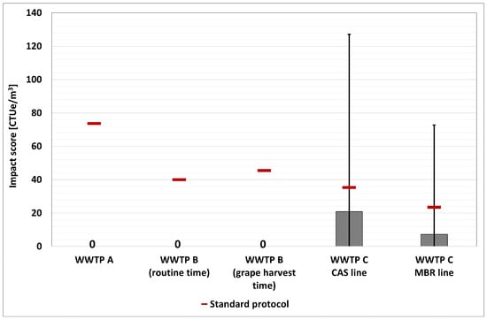 (a) WWTP A; (b) WWTP B, routine time; (c) WWTP B, harvest time; (d) WWTP C, CAS; (e) WWTP C, MBR: calculated environmental footprint using the alternative protocol for the human toxicity/cancer category (the three red dotted lines represent the conventional impact score calculated with the abovementioned three ways). The character “/” indicates that the assay was not performed. The Ames test histogram shows that the impact score is lower than the displayed value.