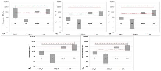 Based on the various reference compounds and bioassays performed, 17 scenarios for each wastewater treatment plant were developed as part of the novel procedure (see Figure 3 and Figure 4). The red dotted lines represent the impact scores calculated considering the substances whose concentrations were > their relative LOQs. A thorough examination of the impact scores derived by the alternative approach reveals that estimations based on metals as reference compounds result in lower impact scores for all plants and tests, except for the result of the luminescent bacteria assay developed with cadmium as the reference compound (only for WWTP A). In contrast, the estimation based on organic reference substances resulted in a high impact score. Furthermore, a detailed examination of the graphs reveals that the impact score based on the DCF as a reference substance has much more consistent effects.