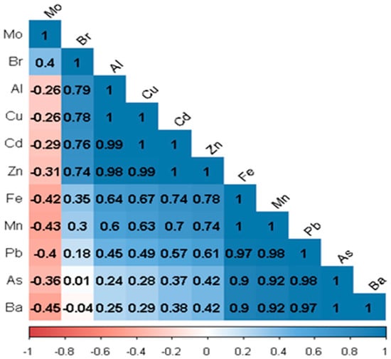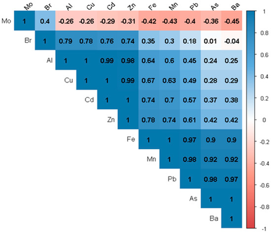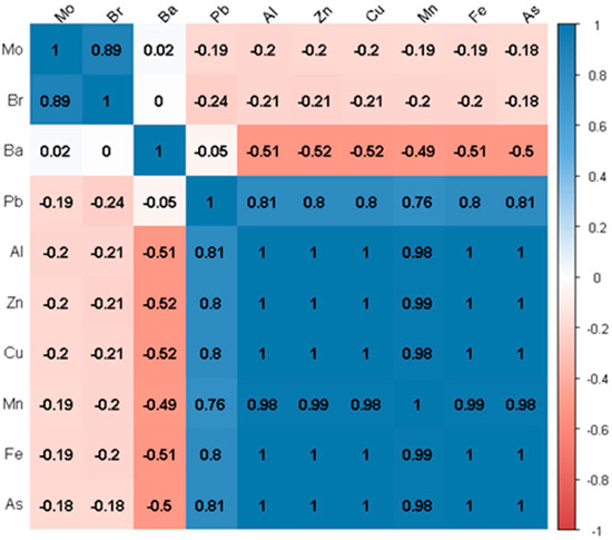 On the other hand, a correlation could be found for both surface water and groundwater samples. In these samples, a positive correlation was found between Al-Cd-Zn (0.90 ≤ r ≤ 0.99, p < 0.05). Likewise, a highly significant correlation was visualized in Fe–Pb–As–Ba–Mn, indicating that these contaminants behave similarly. In the same way that occurs with surface water, Mo is the only metal that does not present a connection with the other metals, thus showing that Mo comes from a different source of contamination, either natural or anthropogenic.