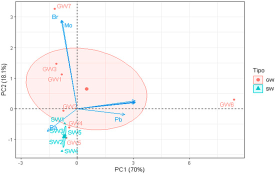 Principal component analysis (PCA) was applied to facilitate understanding and thus correctly examine the sources of origin of heavy metals in the samples obtained from both surface and groundwater. The PCA of samples obtained from surface and groundwater reduced the number of variables to only two principal components (see Figure 8 ), thus accounting for the variation in the data, as 88.10% was obtained. In other words, PC1 explained 69.98% of the variance and exhibited the highest loadings of Al, As, Cu, Fe (0.38), Mn (0.37), and Pb (0.31).