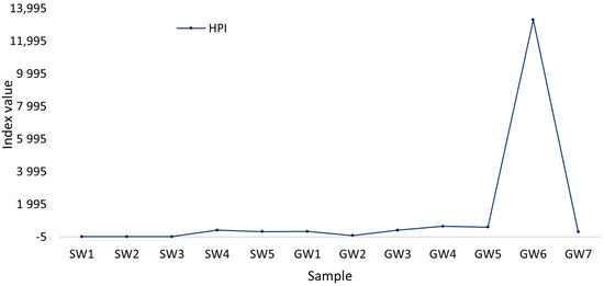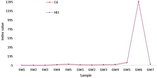 Figure 10 and Figure 11 show the results of the surface and groundwater contamination indices (Cd, HEI, and HPI). The scale and average assessment of the HPI are from 23.5 to an amount of 13,305.24 and 1378.58. The demand originated by metal contamination was calculated using the Cd index in average values and a range of 126.5 and −5.47 to 1403.5, respectively. HEI values ranged from 2.52 to 1411.56 (mean = 134.5).
