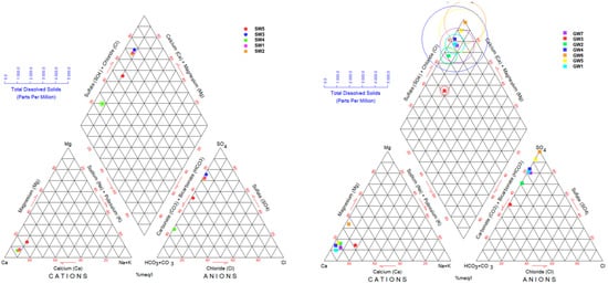 The Piper diagram provides that the samples identified in the study area show multifaceted surface water (a) which contains calcium sulfate for samples SW1, SW2, SW3, and SW5 and calcium bicarbonate for sample SW4. Additionally, groundwater (b) is calcium sulfate (see Figure 13) [52].