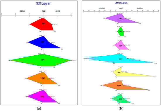 The Stiff diagram was used to determine the concentration of cations and anions in each sample. The results indicate that surface water (a) is dominated by sulfate, except at point SW4 where bicarbonate is the predominant anion, and the predominant cation is calcium. In groundwater (b), sulfate is the predominant anion, and the predominant cation is calcium.