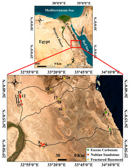 The study area lies between 25°50′–27°00′ N and 32°30′–34°25′ E in the CED, Egypt (Figure 1). The geologic setting of the CED is represented mainly by the Precambrian basement rocks (igneous and metamorphic), which form the Red Sea Hills, and it is bordered on the eastern side along the coast by a narrow strip of sedimentary succession, and on the western side, it is also bounded by sedimentary rocks that extend up to Nile Valley. Basement rocks includes gneisses, serpentinites, metagabbros, and metabasalts that have been intruded by volcanic and younger granitic rocks and are overlain by molasse sediments (metasediments) [39,40]. After a long period of tectonic activity, the sedimentary rocks were deposited inside the subsidence blocks (basins) of the basement rocks near the coastal plain and on the western side until the Nile Valley [41]. The Nubian Sandstone Formation of Lower Cretaceous age, the oldest rock unit in the sedimentary succession, is distinguished by fine- to coarse-grained sandstone with some shale and clay beds [42]. It is overlain by Late Cretaceous to Eocene shale and carbonate marine deposits [43]. The post-rift sediments are comprised of alluvial and alluvial fans deposits. The groundwater in the Central Eastern Desert is available at different depths and lithology. Based on the lithology, three main regional aquifer systems are distinguished; they are the Eocene Carbonate, the Nubian Sandstone (Upper Cretaceous sandstone, shale, and marl layers), and the underlying Fractured Basement aquifer (Precambrian igneous and metamorphic rocks).