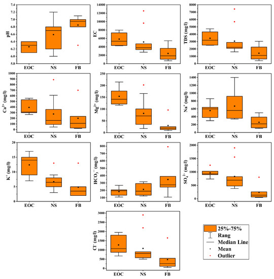 Boxplots of physicochemical parameters and major ions in EOC, NS, and FB aquifers.