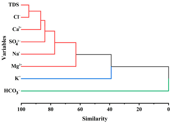 Table 2 displays R values of the PCC between physicochemical parameters and major ions of the investigated groundwater samples. The correlation matrix shows a significant positive correlation of TDS with Cl− (R = 0.937), SO42− (R = 0.915), Na+ (R = 0.880), Ca2+ (R = 0.879), Mg2+ (R = 0.794), and K+ (R = 0.556). Moreover, it was observed strong positive correlation of Cl− with Ca2+ (R = 0.930), SO42− (R = 0.817), Mg2+ (R = 0.804), Na+ (R = 0.797), and K+ (R = 0.507). likewise, SO42− with Na+ (R = 0.848), Mg2+ (R = 0.755), Ca2+ (R = 0.716), and K+ (R = 0.504). Ca2+ exhibits a positive correlation with Mg2+ (R = 0.798), which is most likely owing to the dissolution of dolomite and calcite. HCO3− exhibits a negative and weak correlation with the other ions as well as TDS. This means that the majority of cations are strongly associated with Cl− and SO42−. It may indicate the impact of seawater intrusion on groundwater because the major anions in seawater are Cl− and SO42−. The R-Mode (variables) dendrogram created using HCA (Figure 3), supports the inferred relationship between TDS and the major ions.