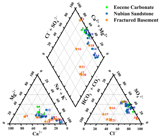 The physicochemical parameters (pH, EC, and TDS) and the major ion concentrations of investigated groundwater samples within the CED representing different aquifer types (EOC, NS, and FB) are presented in Table 1 and Figure 2. The EB% in this study was within 5%, indicating that the chemical analysis was accurate [4,6,13]. From Figure 2 it is evident that the groundwater in the investigated wells samples is characterized by a narrow range of pH values from slightly acidic to neutral (varied between 6 to 7.2). EC ranged from 4270.0–7980.0, 2730.0–12,550.0, and 690.0–5460.0 in the EOC, NS, and FB aquifers, respectively. These values exceeded the recommended EC limit for natural water (1300 uS/cm at 25 °C; WHO [5]), except for FB aquifer (samples 16, 17, and 20). TDS, like EC, varied greatly, with the higher the value recorded in the NS aquifer and the least values recorded in the FB aquifer. The marked differences in the EC and TDS values reflect significant variation in the hydrochemical features in the EOC, NS, and FB aquifers. The concentration of the major ions in the groundwater samples varies significantly; Ca2+ (20.0–888.0), Mg2+ 9.11–214.8), Na+ (105.0–1400.0), K+ (2.0–17.0), HCO3− (108.6–791.8), SO42− (50.0–1900.0), and Cl− (55.0–2900.0 mg/L). Data suggested that the chemistry of groundwater was heterogeneous and governed by a variety of mechanisms, such as evaporation, water-rock interaction mixing processes, and saltwater intrusions [19,38,52]. In a recent study by Sherif et al. [53], groundwater mixing between different aquifers in Egypt’s Eastern Desert was proven utilizing 36Cl abundances and 37Cl/35Cl, 2H/1H, and 18O/16O isotope ratios. In most cases, the three aquifers are dominated by Na+, followed by Ca2+, Mg2+, K+, and Cl−, followed by SO42− and HCO3−. Some fluctuations are observed between Ca2+ and Na+ in NS and FB aquifers. The anionic distribution in the FB aquifer shows complex fluctuation between HCO3−, SO42−, and Cl−.