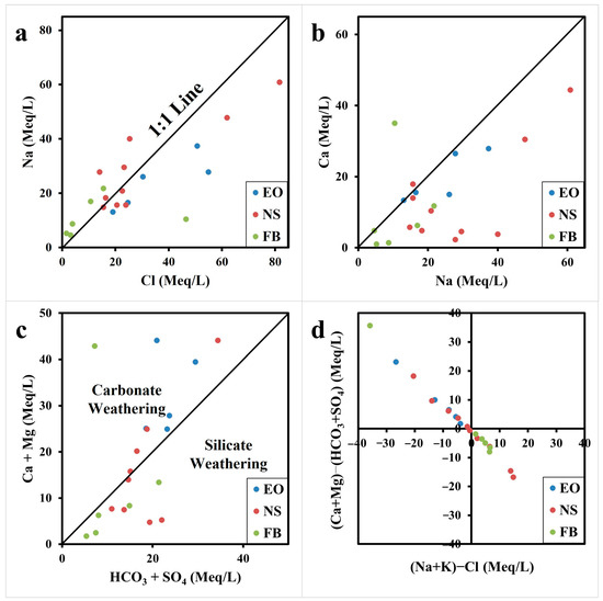 Plots of the EOC, NS, and FB groundwater samples on scatter diagrams: (a) Na+ vs. Cl−; (b) Na+ vs. Ca2+; (c) (Ca2+ + Mg2+) vs. (HCO3− + SO42−); (d) (Ca2+ + Mg2+)-(HCO3− + SO42−) vs. Na+ + K+-Cl−.