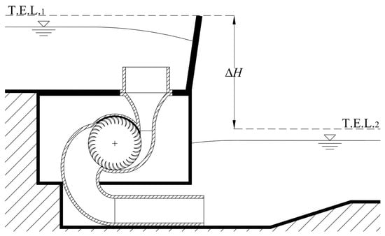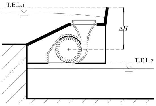 Section view of the UL-PRS turbine in a symmetry plan: T.E.L. is the total energy level and ΔH is the gross available hydraulic jump.