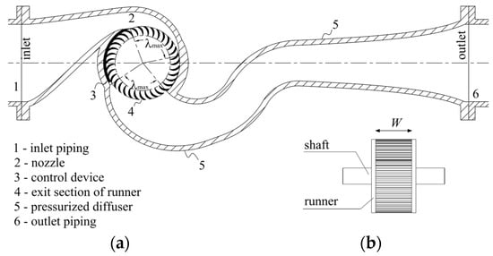 PRS is an inline turbine with a mobile flap for hydraulic regulation, a pressurized diffuser and the same runner as the cross-flow turbine (Figure 2). The design procedure for the PRS can be divided into two steps. The first step is the design of the runner, i.e., rotational velocity ω, diameter D, width W, blade thickness t and number of blades Nb. The second step is the stator design, i.e., nozzle and diffuser.