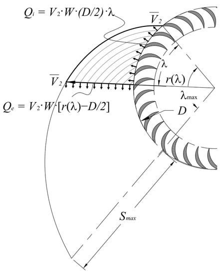 The last part of the diffuser, marked as III in Figure 5, is a straight divergent duct with a fixed height equal to R (Figure 8). The axial velocity component in a generic cross-section is assumed to change linearly, with a corresponding hyperbolic growth of the cross-section area [17], according to: