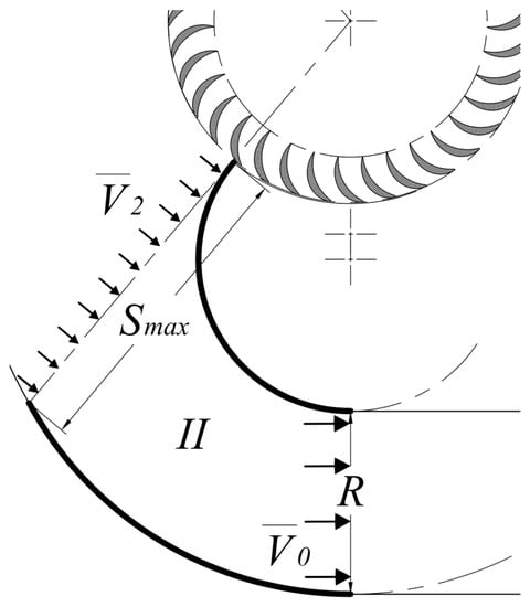 In the second part of the diffuser (II in Figure 5), the height of the rectangular cross-section decreases to prevent the generation of vortices because of path curvature changes. The width of this part remains constant and is equal to W. The final cross-section is vertical, its height is set equal to R (Figure 7) and the tangent at the final point of the two profiles is horizontal.