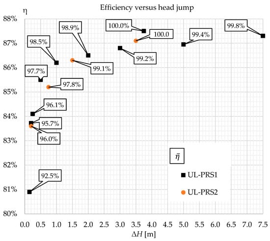 Two-dimensional efficiency comparison between UL-PRS1 and PRS turbines for different head jumps.