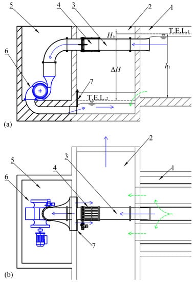 (a) Section and (b) planimetric view of a UL-PRS type turbine plant, where: 1. Inlet channel; 2. Discharge channel; 3. Suction pipe; 4. Butterfly valve; 5. Underground room; 6. T Hydropower System (blue lines); 7. Gate valve. In thick solid lines, the modifications are proposed for the new solution.